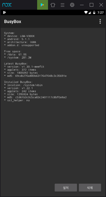 현재 Android 5.1(롤리팝)이 적용되어 있는 에뮬레이터이다. 루팅을 따로 하지 않아도 시스템 설정 옵션 'ROOT 켜기'를 이용하여 루팅된 가상 머신을 사용 할 수 있다.